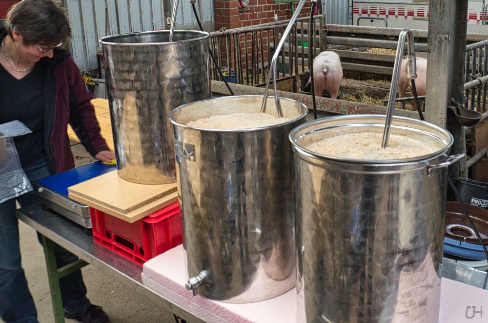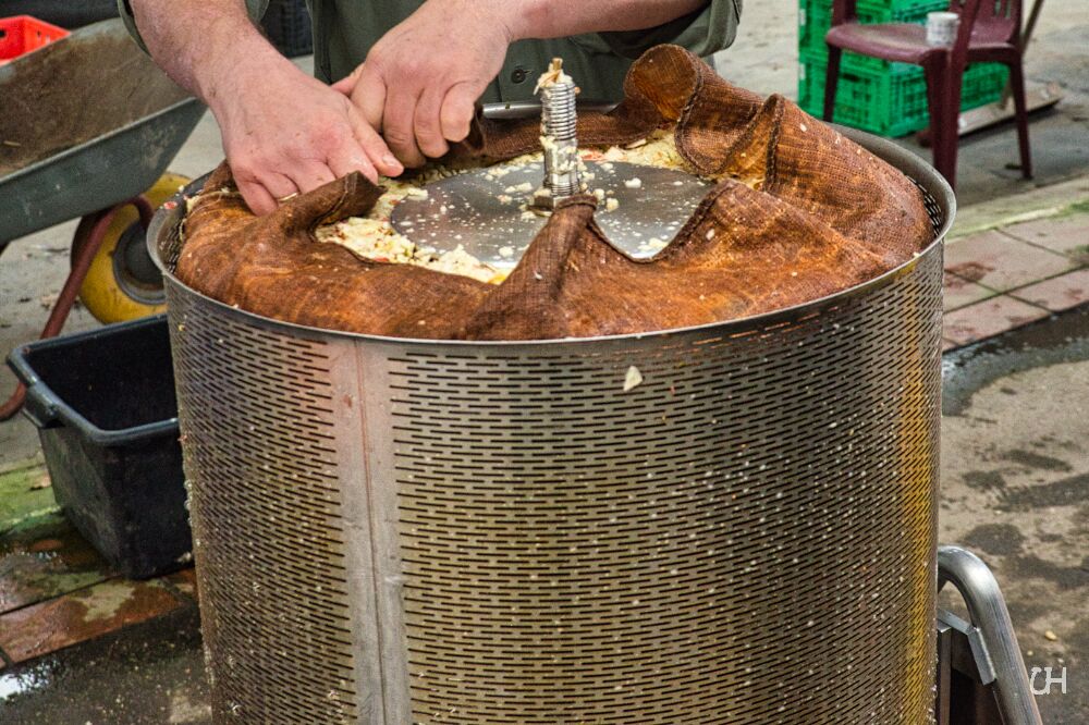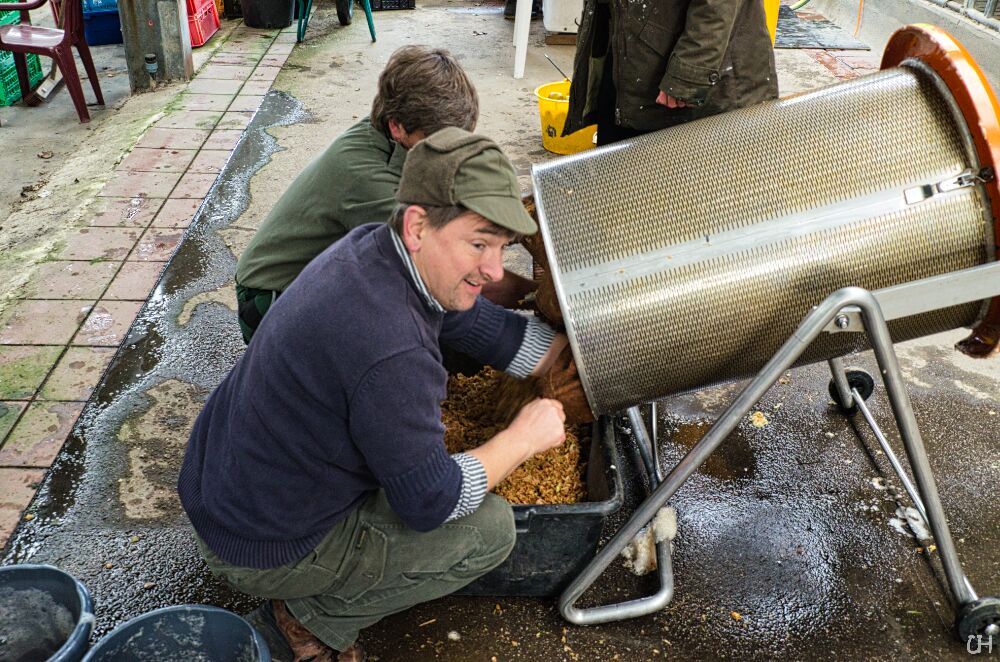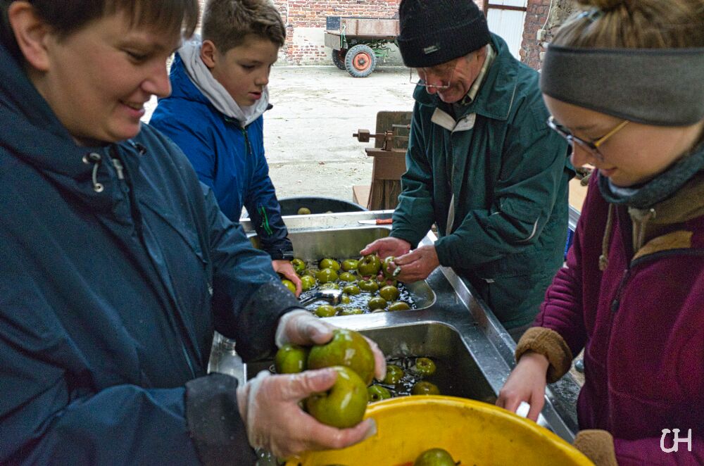 Natur & Kultur im Achterhoek: Am 16.10.2021 trafen sich ab 9:30 Uhr etwa 50 anpackende Hände. Aus Äpfeln und Birnen wurde köstlicher Apfelsaft gemacht. Etwa 1.600 kg Obst wurden zu 825 Liter Saft verarbeitet. Traditionell wurde souverän geschreddert, gepresst, erhitzt und abgefüllt. Die meisten der anwesenden NuK-Mitglieder waren bereits in den vergangenen Jahren dabei, als auf dem Rammendonkshof bei Familie Eickhoff eigens geerntete Äpfel verarbeitet wurden.